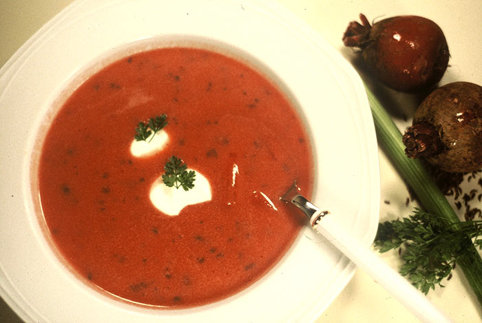 Rote Rübensuppe mit Zitrone und Krennockerln
