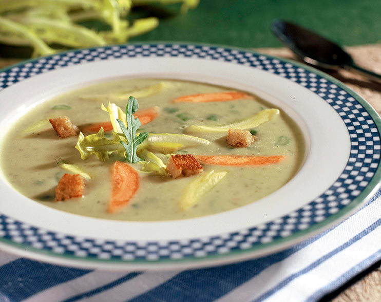 Zwiebelringe in Olivenöl goldgelb anrösten, Kartoffel zugeben, kurz mitrösten, mit Gemüsebrühe auffüllen, salzen und weich kochen lassen. Im Mixglas mit Kresse, Salbei, Bärlauch, Oliven und Rahm pürieren, mit Pfeffer und Muskat abschmecken. Anrichten und mit wilden Veilchen und Kapuzinerkresse garnieren.JAHRESZEITBEDINGT ERSETZEN DURCH: