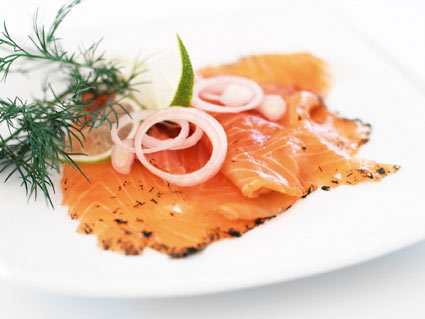 Rohzucker, Saft von 3 Limetten, fein gehackte Minze und Fischsauce in einem kleinen Gefäß miteinander vermengen und mit Pfeffer, Koriander und Meersalz abschmecken. Das Lachsfilet entgräten und in hauchdünne Scheiben schneiden. Diese nebeneinander auf einen flachen Teller legen, mit der Marinade dünn napieren. Die feingeschnittenen Schalotten, das untere Drittel der Zitronengras-Stängel und die hauchdünnen Limettenstreifen über den Lachs streuen. zurück zur Übersicht