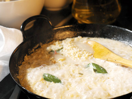 Klein gewürfelte Schalotten in Olivenöl anschwitzen, den gewaschenen reis hineinstreuen und schwenken, bis er glasig wird. Mit Pfeffer, Salz, Lorbeerblatt und Knoblauchzehe würzen. Mit Weißwein ablöschen und unter ständigem Schwenken (nicht rühren) dünsten lassen. Immer wieder mit heißer Gemüsebrühe aufgießen, sobald die Flüssigkeit verkocht ist.