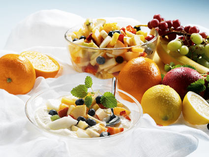 Die Sahne steif schlagen, mit Ingwer, Kardamom und Anis fein abschmecken. Den Obstsalat in Dessertschälchen geben und mit Sahnehäubchen garnieren.